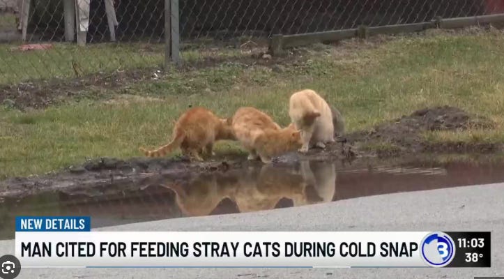 An Ohio man “was cited for feeding stray cats behind a building he owns during a recent stretch of harsh winter weather.”